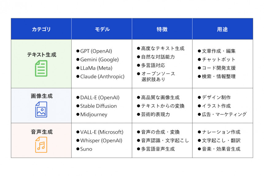 生成AIの核となるのが、大規模言語モデル(LLM)と呼ばれる仕組みです。これは、インターネット上にある莫大なテキストデータを学習し、人間が読んだり書いたりするときの言語運用のパターンを捉えて、次に来る単語やフレーズを予測します。代表的なものにはOpenAIのChatGPTやMeta社のLlama2、GoogleのGeminiなどがあります。こうしたモデルは文章補完、翻訳、要約といった言語タスク全般に高い性能を発揮します(参考)。